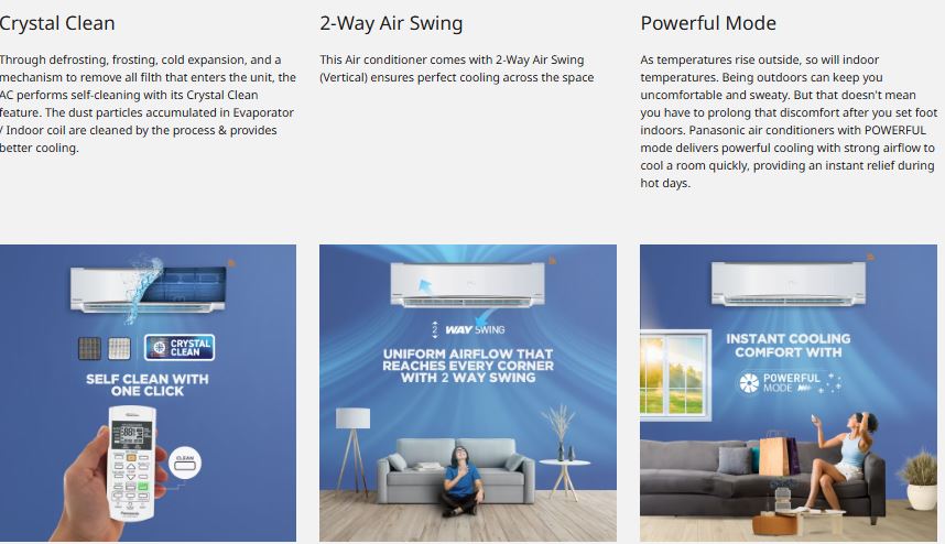The Panasonic 2 Ton Smart Inverter Split AC is designed for large-sized rooms (171–210 sq. ft.), delivering powerful and consistent cooling even during extreme summers. With 7-in-1 Convertible Cooling and advanced True AI Mode, the AC intelligently senses room temperature and usage patterns, then automatically adjusts cooling capacity and fan speed for maximum comfort with optimal energy efficiency. Its strong 653 CFM airflow ensures quick and uniform cooling across every corner of the room, even when outdoor temperatures soar up to 52°C.