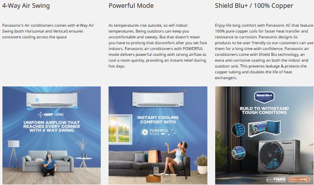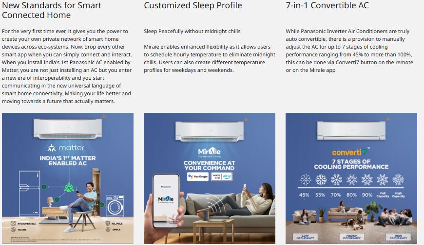 The Panasonic 2 Ton 4 Star Wi-Fi Inverter Smart Split AC is designed for large-sized rooms (171–210 sq. ft.), delivering powerful, fast, and energy-efficient cooling. Featuring 7-in-1 Convertible Modes with True AI (Converti7), the AC intelligently senses room temperature and predicts cooling demand to automatically optimize compressor speed and fan operation. Users can also manually select cooling capacities from 40% to 90%, Full Capacity, or High Capacity, ensuring customized comfort while reducing electricity consumption.