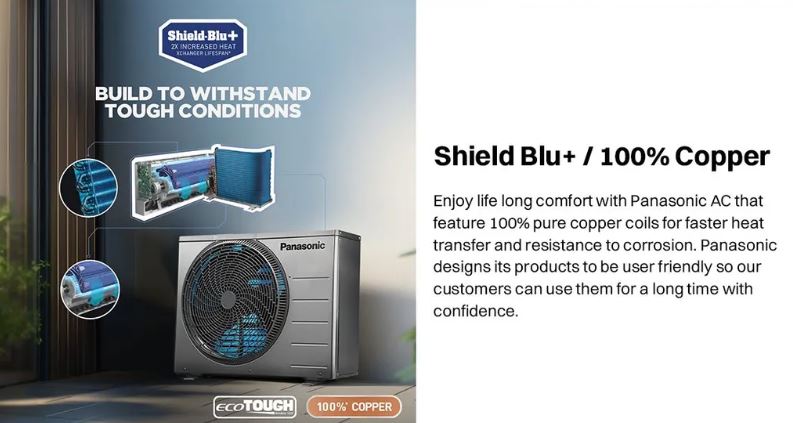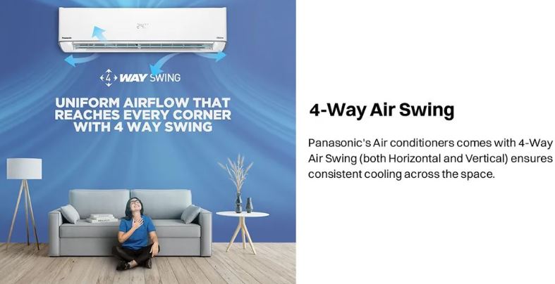 For healthier indoor air, the AC is equipped with an advanced filtration system with PM0.1 and Anti-Dust filters, effectively trapping fine particles, dust, and allergens. The 4-Way Air Swing ensures uniform cooling in every corner, while stabilizer-free operation protects the unit from voltage fluctuations. Built with a 100% copper condenser and Shield Blu+ coating, this air conditioner offers superior durability, faster heat transfer, and long-lasting performance.