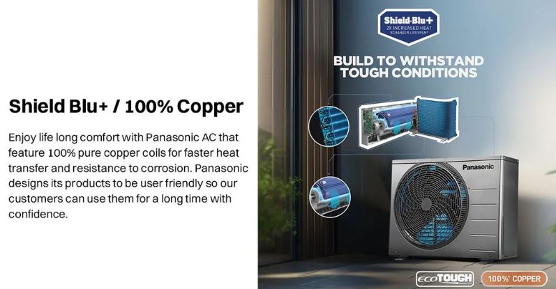 Designed with advanced filtration including Anti-Dust and PM0.1 filters, it helps remove fine particles, allergens, and pollutants for cleaner indoor air. The 4-Way Air Swing ensures uniform cooling across every corner of the room, while stabilizer-free operation protects the unit from voltage fluctuations. Built with a durable copper condenser and Shield Blu+ coating, this air conditioner offers long-lasting reliability even in harsh weather conditions.