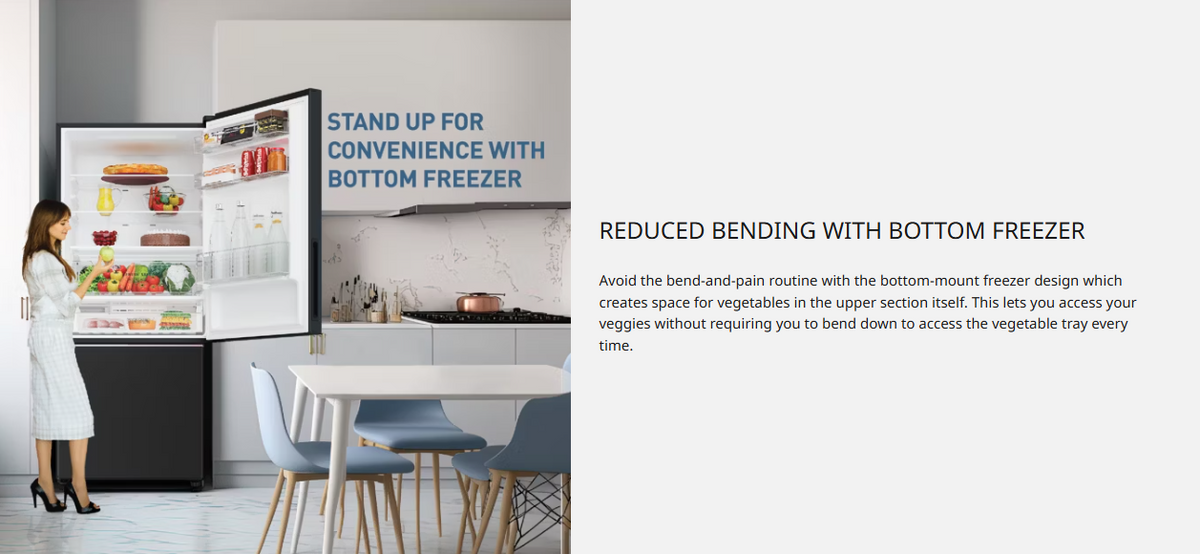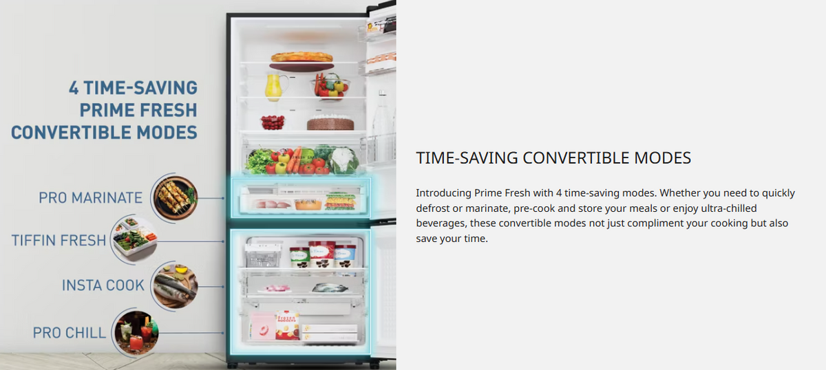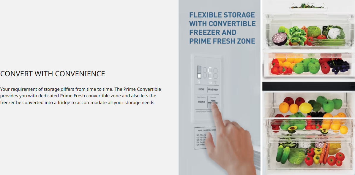 | Additional Features | Automatic Defrost, Full Flat body | Recess handle, High Gloss Steel|Balck Mirror, Prime Convertible | Prime Fresh 4 sub modes | Bottom Mount Refrigerator, Stunning Exteriors | Durable & Spacious interiors |