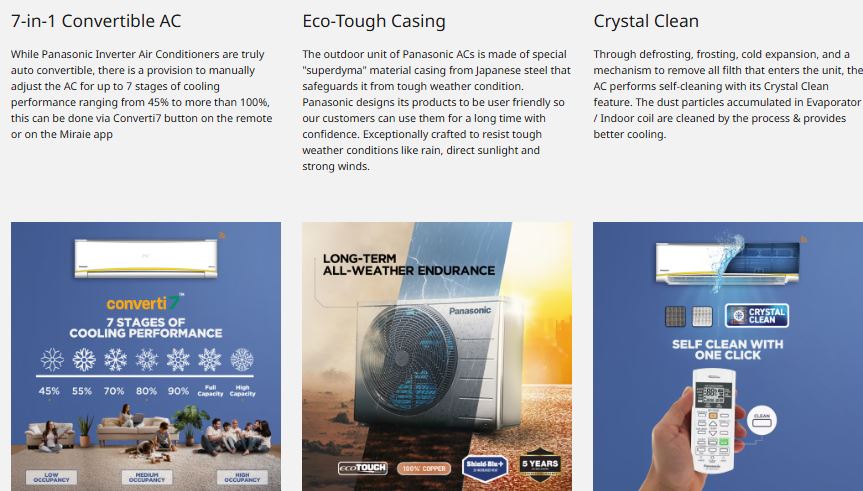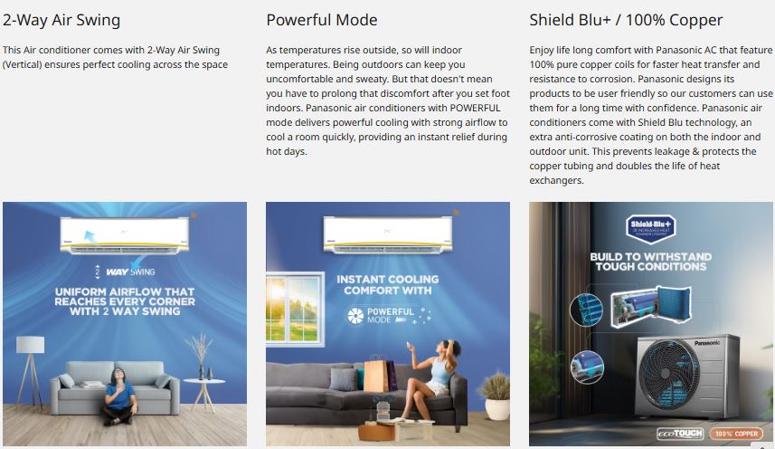 The AC also focuses on durability and healthier indoor air. It features a 100% copper condenser coil for better heat transfer and long-lasting performance, while the Ag Clean Plus filter helps remove dust, allergens, and harmful particles from the air. The Eco-Tough outdoor unit casing protects the system from harsh weather conditions, ensuring reliable operation over time. Combined with inverter technology and strong airflow, this model delivers quick, uniform cooling and comfortable indoor temperatures even during hot summer days.