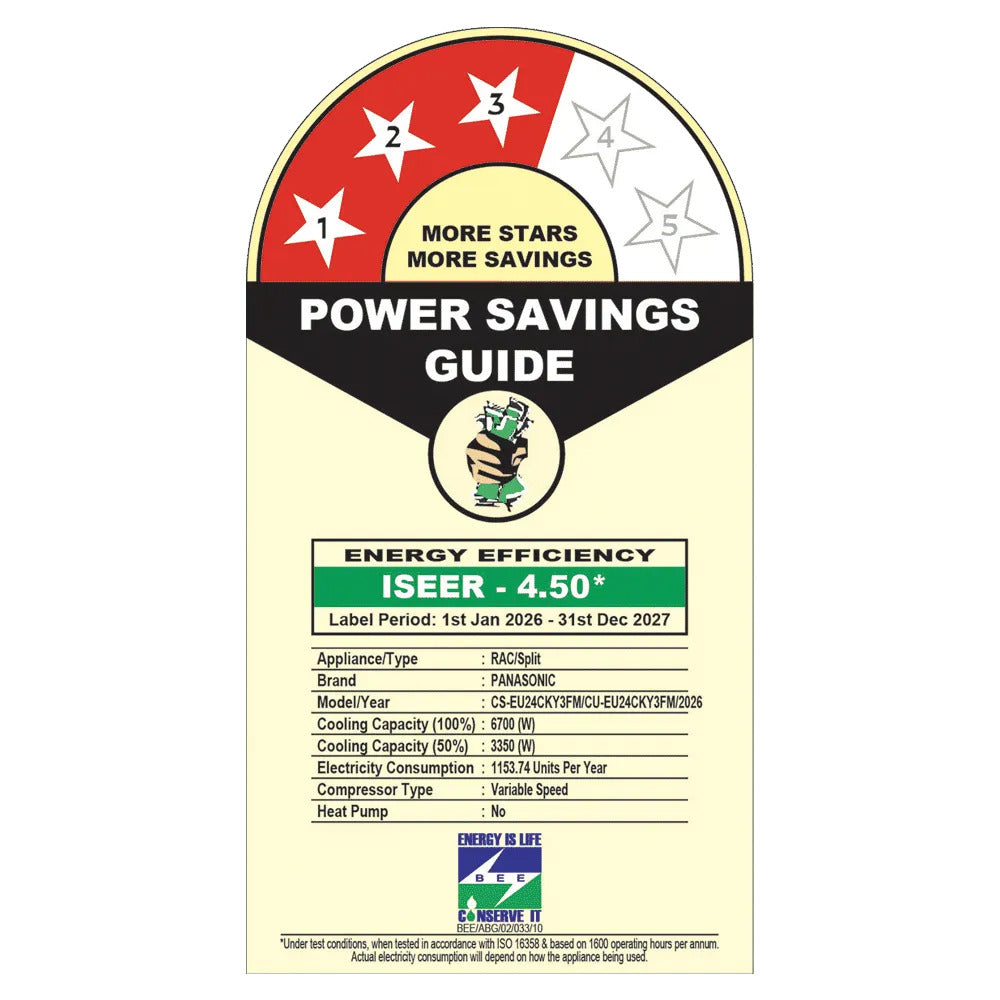 The Panasonic EU 8‑in‑1 Convertible 2 Ton 3 Star Inverter Split Smart AC (CS/CU‑EU24CKY3FM) is designed to deliver powerful cooling and intelligent energy management for large rooms. With its 8-in-1 convertible inverter technology, the AC allows you to adjust cooling capacity based on room conditions and occupancy, ensuring optimal comfort while saving electricity. The 100% copper condenser and durable Eco Tough outdoor unit enhance performance and durability, making it suitable for long-term use even in harsh weather conditions. This 2026 model provides reliable cooling for rooms up to about 260 sq. ft., making it ideal for living rooms, offices, or large bedrooms.