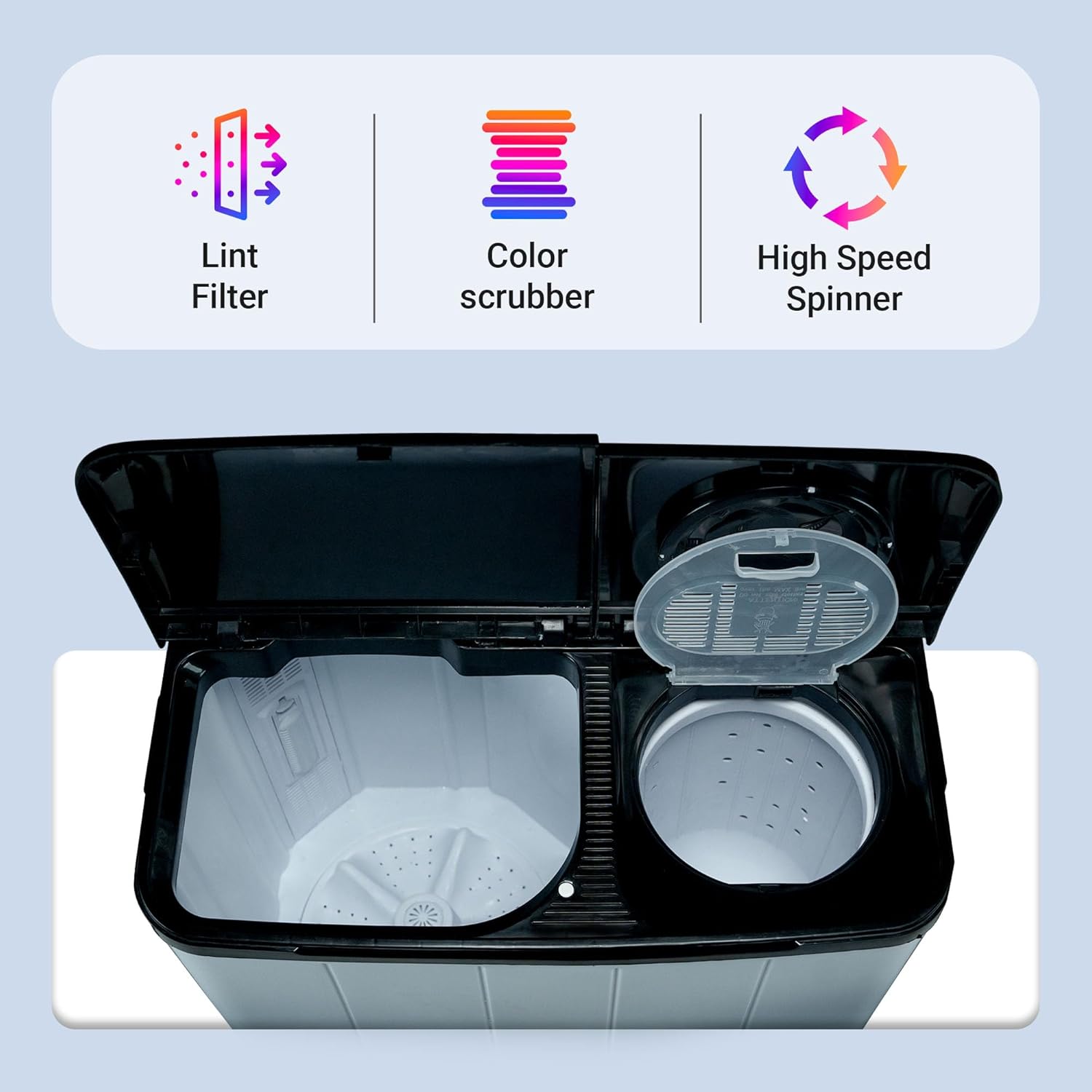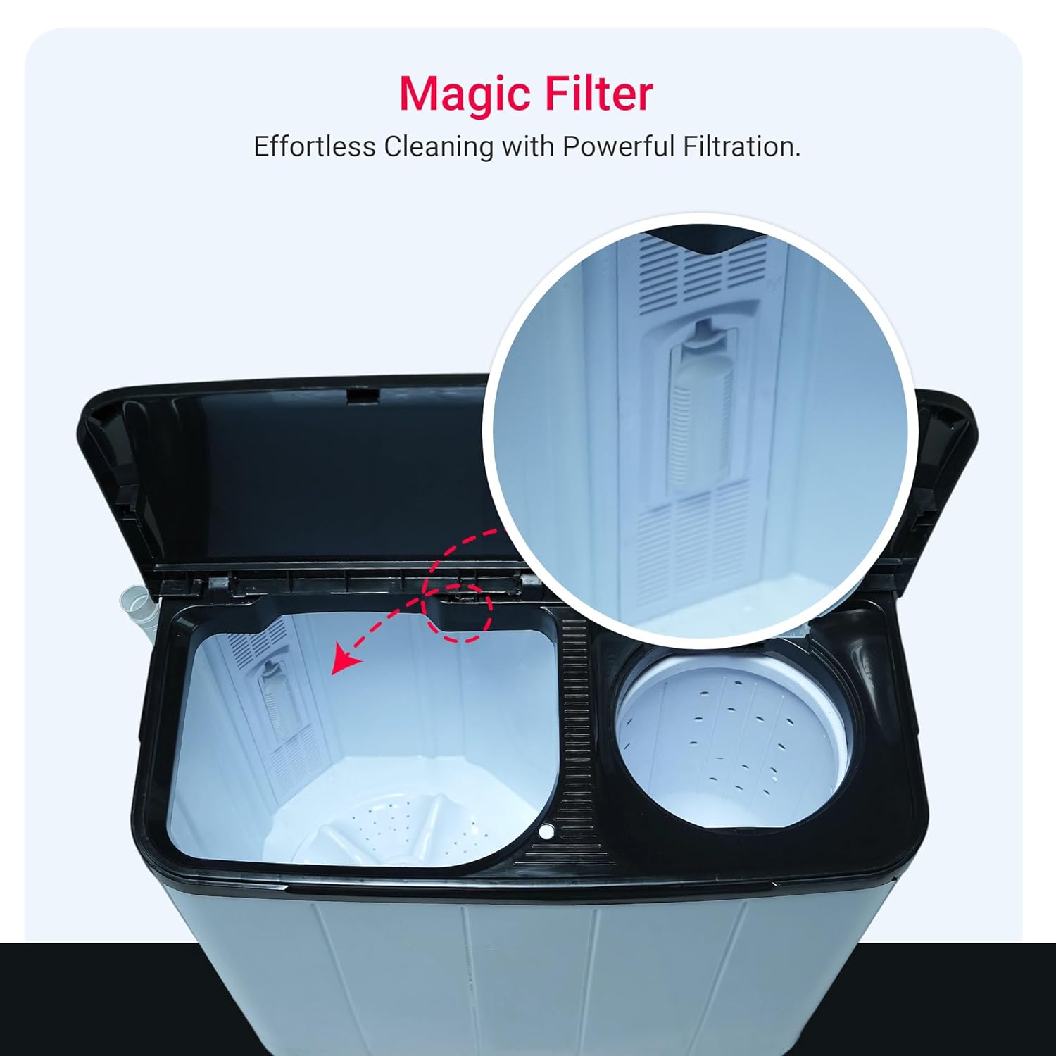 Equipped with a powerful 1400 RPM motor, this washer provides faster spin speeds for quicker drying and cleaner clothes. The heavy-duty motor comes with temperature over-protection for enhanced durability. Practical features like castor wheels for easy movement, three magic filters for better lint collection, anti-vibration rubber, and a rust-free plastic base make it a dependable choice for daily use.