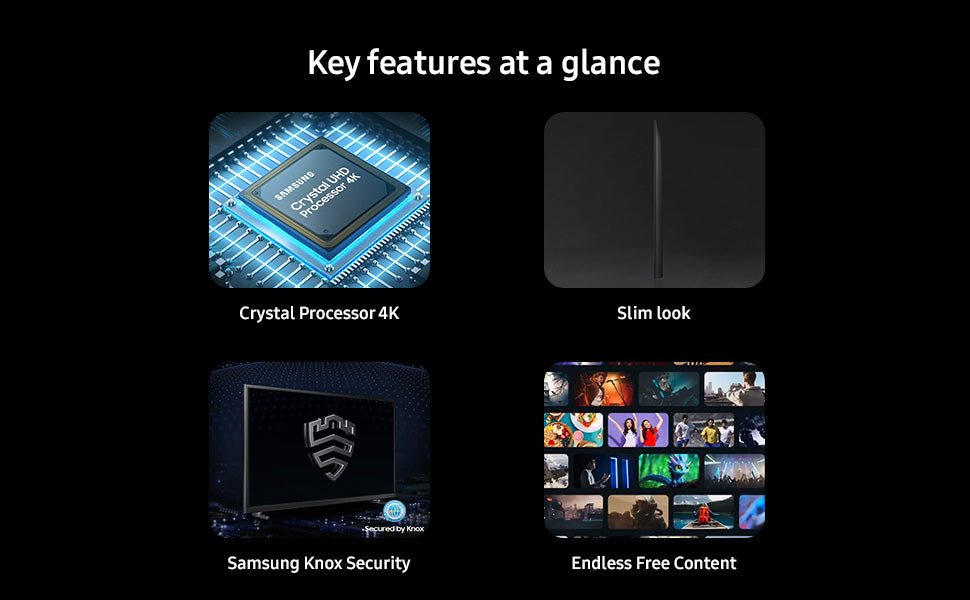 | Special Feature | 4K Upscaling, Crystal Processor 4K, Endless Free Content, Samsung Knox Security, Slim Look |
