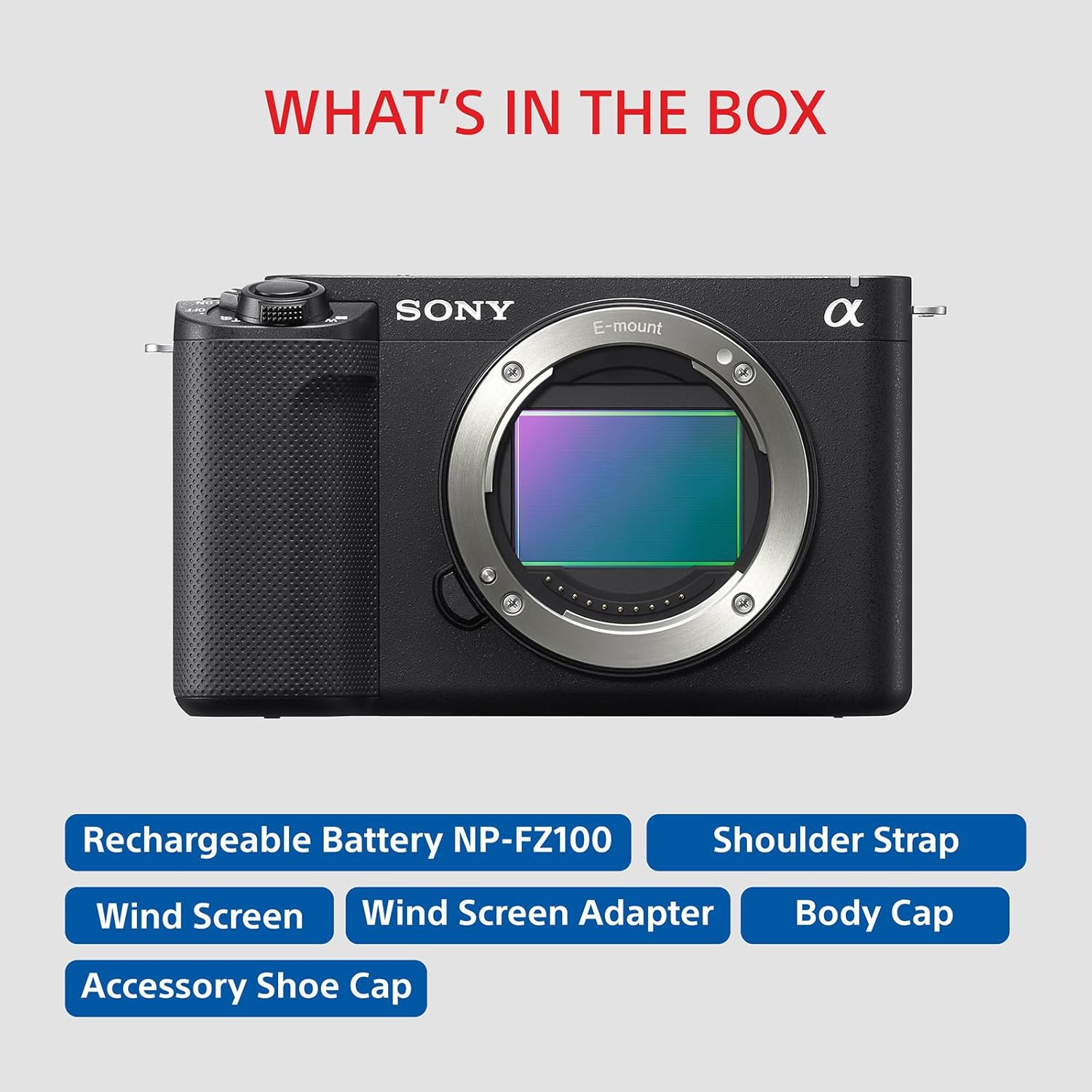 Camera, Rechargeable Battery NP-FZ100, Shoulder strap, Wind Screen, Wind Screen Adapter, Body cap, Accessory shoe cap