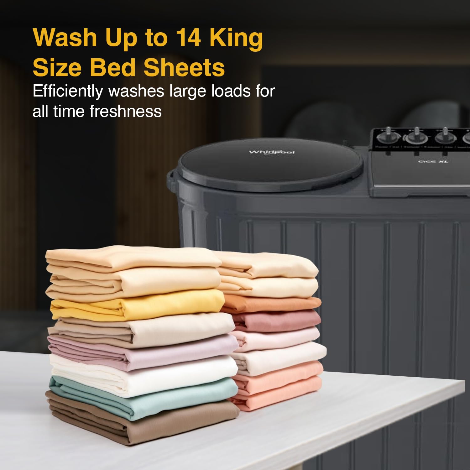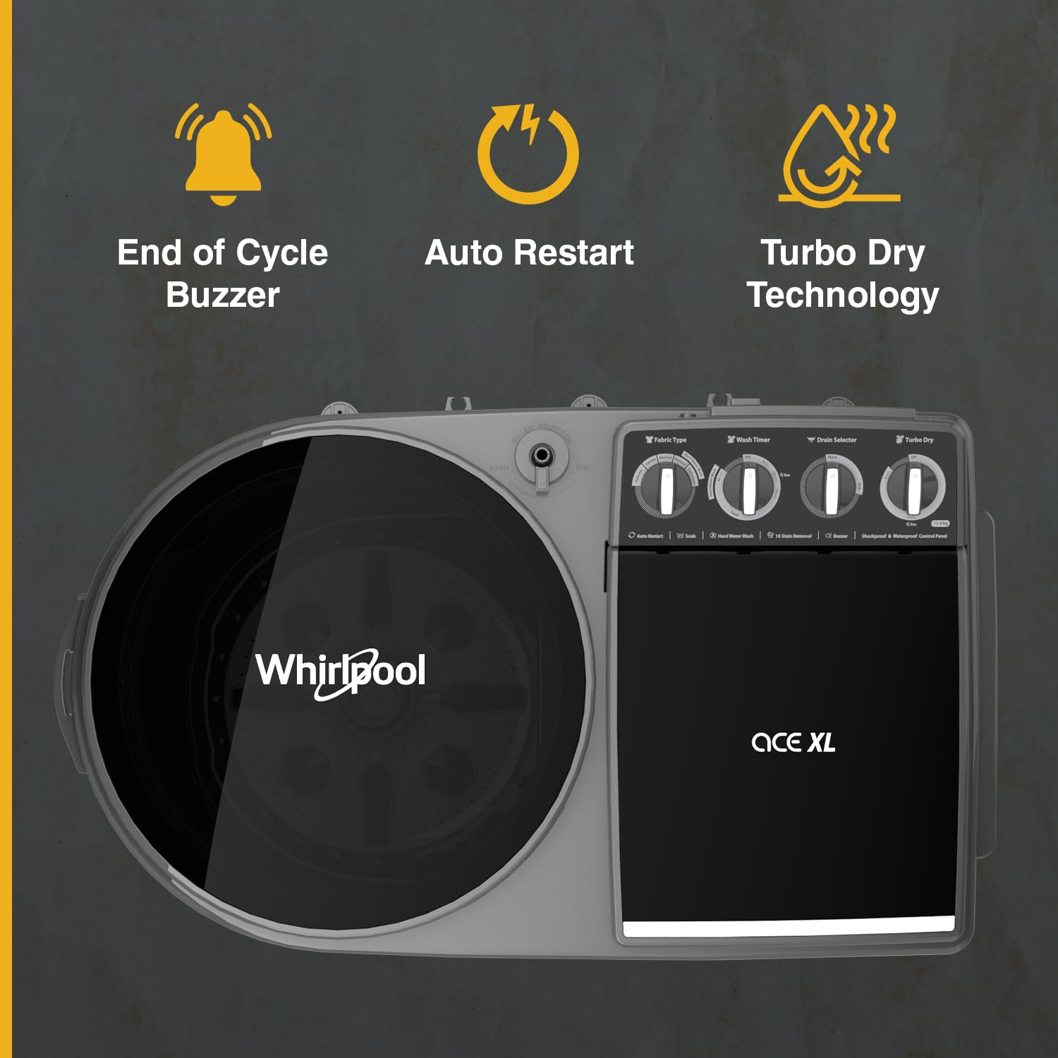 The Whirlpool ACE XL11 DMIX GRAPHITE GREY (30344) is a heavy-duty 11 kg top-load washer made for large families and frequent big loads. Its semi-automatic twin-tub system lets you wash and spin separately, saving time and giving better control over water usage. The bold graphite grey/black finish and rugged build make it ideal for utility areas.