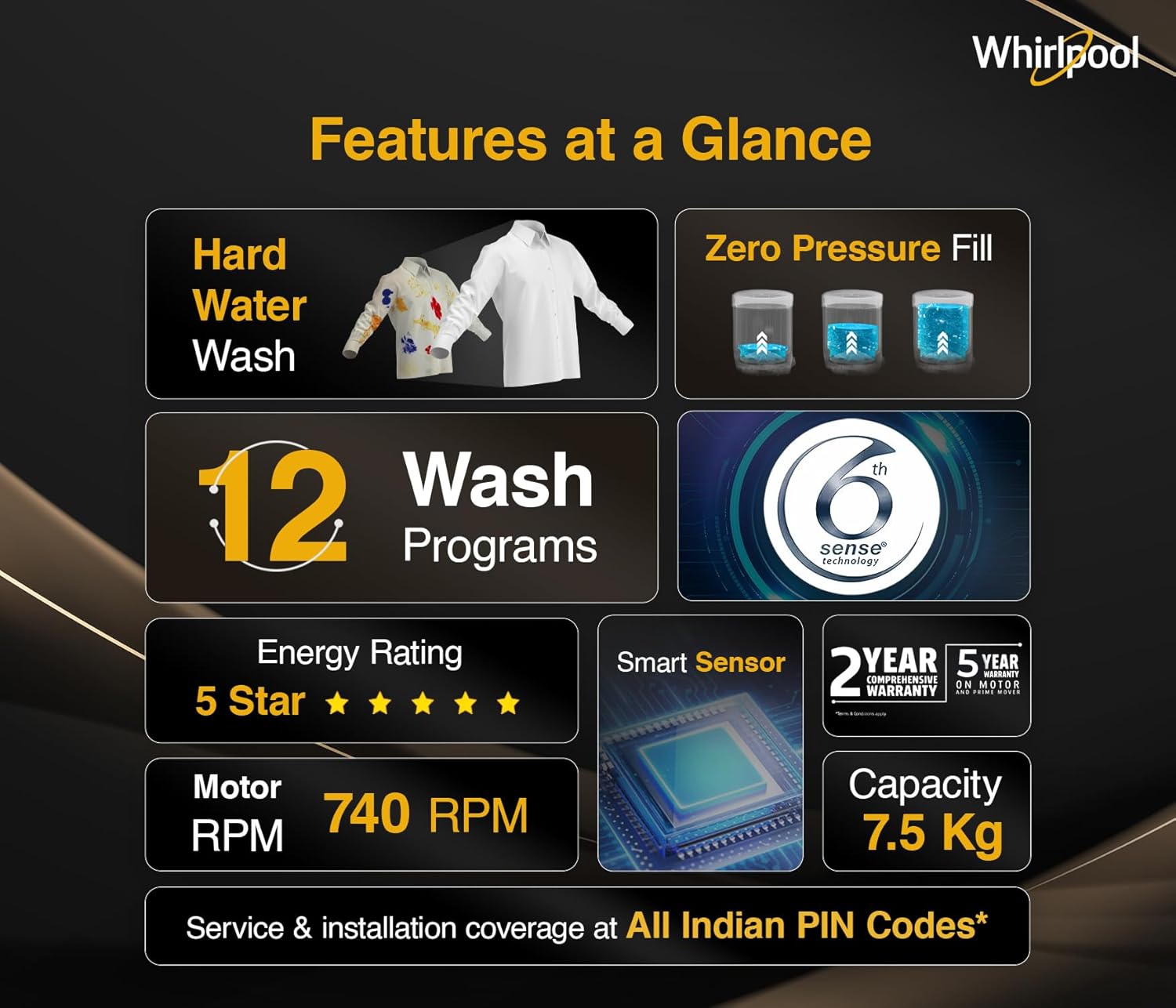 2 years on product, 5 years on motor, (T&C Apply) | Contact Brand for queries/assistance @ [Telephone: 1800 208 1800 , WhatsApp: +919667427788 / & Email: helpdeskindia@whirlpool.com and provide product's model name and seller's details mentioned on your invoice. Brand's service center will allot you a convenient slot for the service.