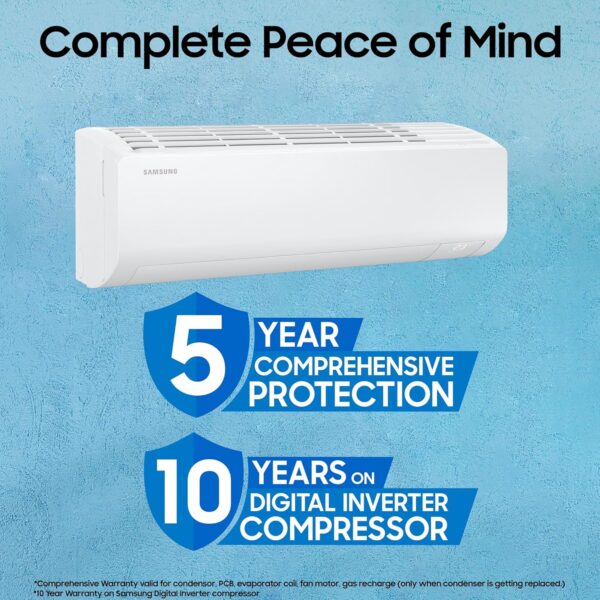 Welcome to Bespoke AI. Introducing the Bespoke AI range of Samsung Air Conditioners. With AI Energy Mode, save upto additional 30% energy savings. Enjoy seamless control with your remote, voice control thru Alexa, Google Assistant and Bixby and your phone. With Convertible 5in1 Technology, you can adjust your AC as per your cooling needs. Get complete peace of mind with 5 years comprehensive warranty and 10 years warranty on Digital Inverter Compressor.