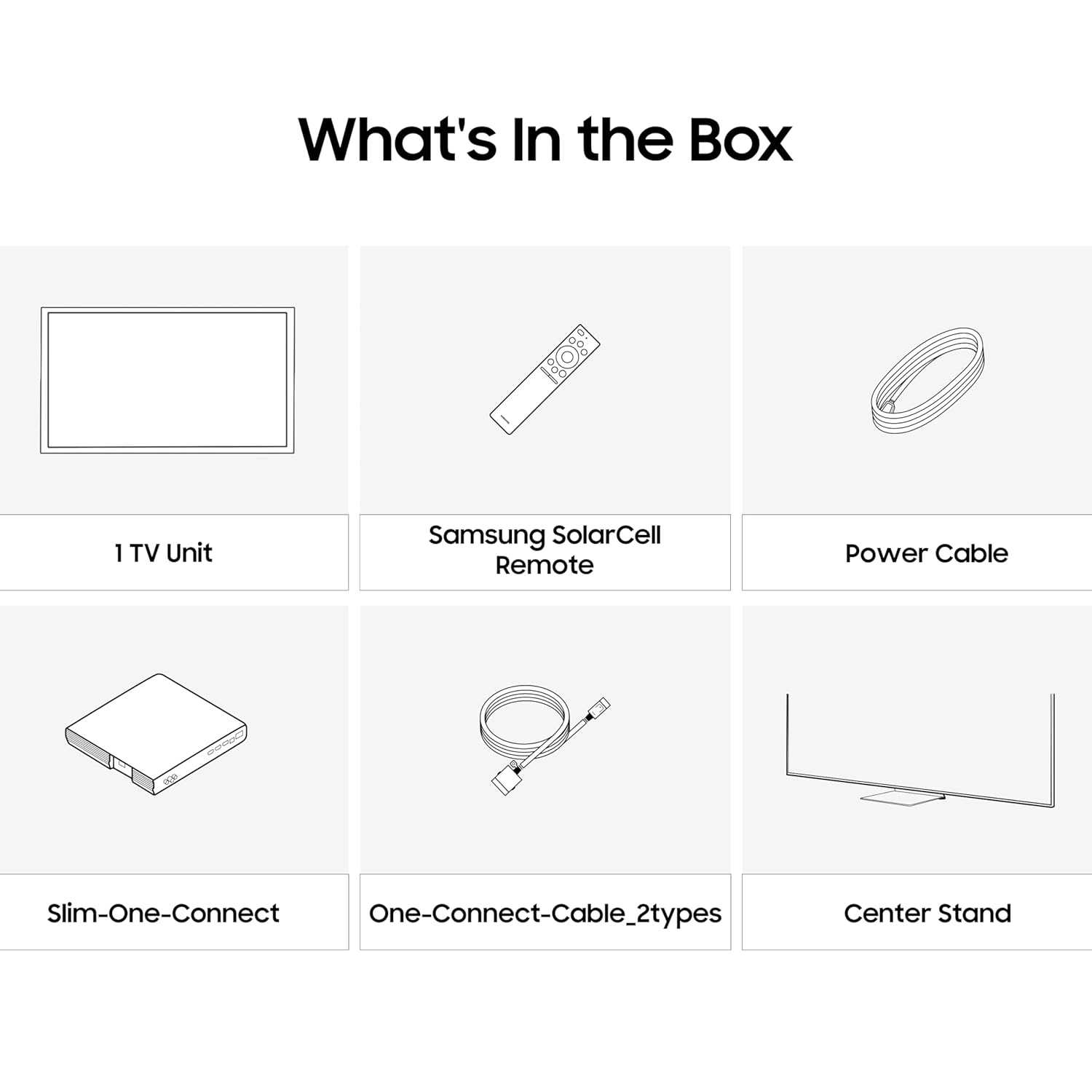 | Box Contents | 1 Number TV | SolarCell-Remote | User-Manual | Power-Cable | One Connect Box | Attachable-Slim-One-Connect | One-Connect-Cable_2types | Center_Stand |