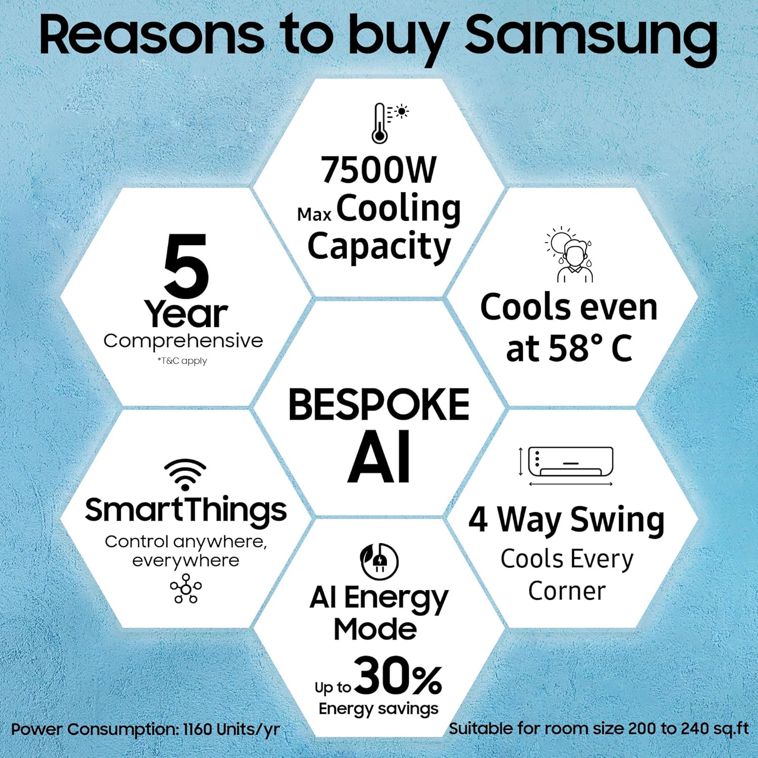 | Special Features | 5 Step Convertible, 4 Way Swing, AI Fast and Comfort Cooling, Wearable Good Sleep mode, Auto Error Diagnosis, 3 Step Auto Clean, BESPOKE AI WindFree , 30% Additional Energy Savings, Digital Inverter Compressor, Wi-Fi, Voice Control with Alexa, Google & Bixby, SmartThings app |