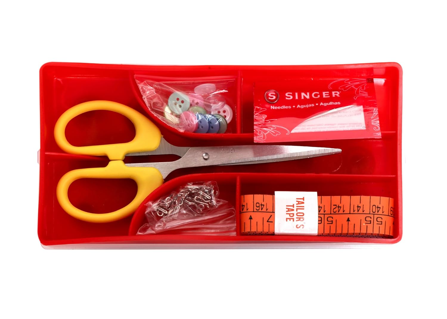 • 1 Unit Scissor, 1 Unit Measuring Tape, 1 Unit Needle Set, 1 Unit Button Set ( 12 Unit Button ), 18 Unit Thread Spools, 1 Unit Hook Set